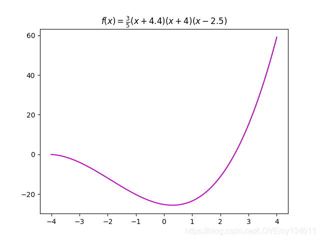 plt.title('$f(x)=\\frac{3}{5}(x+4.4)(x+4)(x-2.5)$')