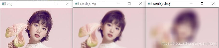 從上圖可以看出來,使用(5,5)卷積進行均值濾波處理后圖像雖然模糊,但還可以辨認。而使用(30,30)卷積進行均值濾波,圖像失真非常嚴重。