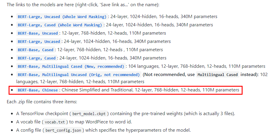 在Google BERT倉庫里下載需要的模型,這里使用的是中文預訓練模型(chinese_L-12_H-768_A_12)