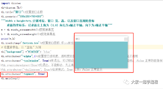 tk.attributes("-topmost", True)#窗體置頂:True 所有窗口中處于最頂層;False 正常顯示