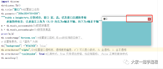 tk.attributes("-alpha",1)#設置窗口透明度,透明度的值是:0~1 可以是小數點,0:全透明;1:全不透明