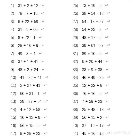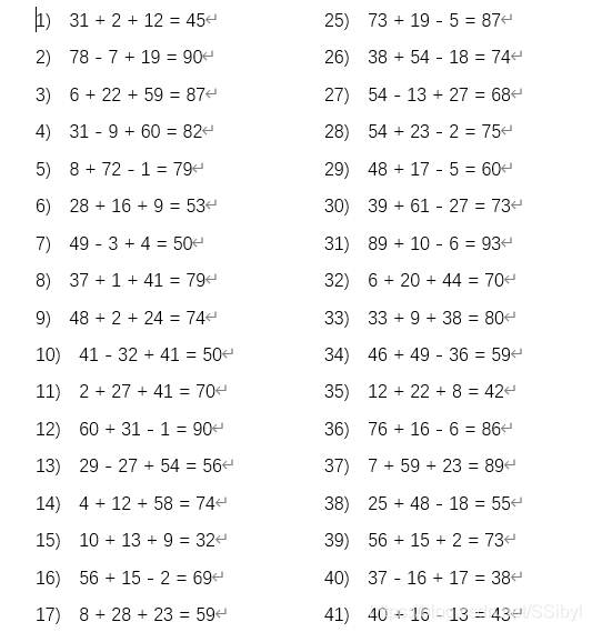 阿姨覺得二元加減太簡(jiǎn)單了,想要三元加減法的算術(shù)題(x + y + z; x + y - z; x - y - z; x - y + z),因?yàn)榈艿苓€小,只會(huì)100以內(nèi)的加減法,不會(huì)負(fù)數(shù),所以出的算術(shù)題不僅計(jì)算結(jié)果要在[0, 100]內(nèi),算式中的任何兩位的計(jì)算也要在[0, 100]內(nèi)。