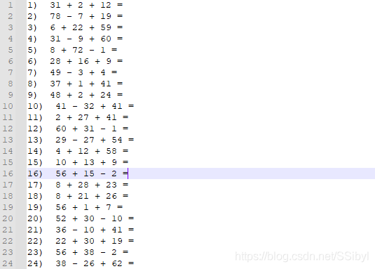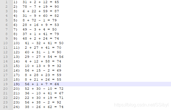 生成在[1,99]內(nèi)的隨機(jī)數(shù)x, y, z,若它們的計(jì)算結(jié)果在[0, 100]內(nèi),且算式中的任何兩位的計(jì)算也在[0, 100]內(nèi),就保存在字符串里,作為答案,如"10 + 13 + 9 = 32";將字符串存入set中,因?yàn)镻ython的set是無(wú)序且不重復(fù)的,所以它會(huì)自動(dòng)打亂和去重;把答案寫入文件,寫入文件時(shí)要寫入index(題號(hào))去掉結(jié)果再寫入另一個(gè)文件,作為題目