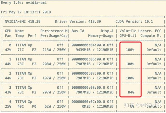 這種癥狀的體現(xiàn)是使用 Nividia-smi 查看 GPU 使用率時(shí),Memory-Usage 占用率很高,但是 GPU-Util 時(shí)常為 0% ,如下圖所示: