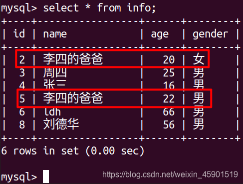 運(yùn)行之后,看看person數(shù)據(jù)庫中 表info 的數(shù)據(jù),確實(shí)刪除成功了: