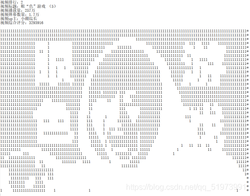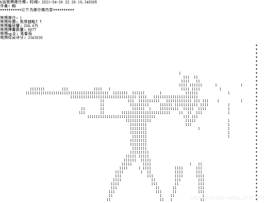 爬取結果如下:(圖片展示,是下載網頁中的的封面圖片(webp格式),首先對其進行格式轉換為jpg格式,然后對其進行二值化處理(對于像素值大于127的像素點直接賦值為0,對于像素值大于127的像素點直接賦值為1)。然后遍歷所有的像素點,對于像素值為0的像素點(即為黑色),寫入“1”,對于像素值為1的像素點(即為白色),寫入“空格”,實現簡單的圖片模擬顯示。)