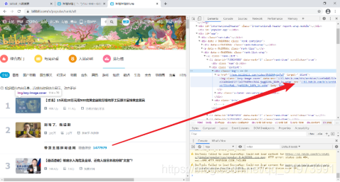 (3)網頁分析——點擊開發者工具左上角的抓手工具,選中頁面中視頻,發現每個不同的視頻都存放在不同的li標簽中