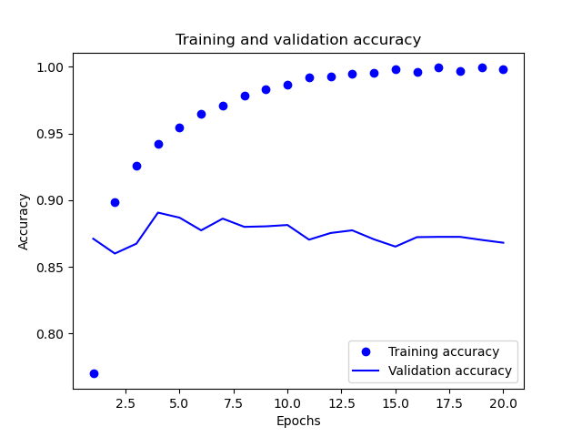 通過對訓練和校驗指標的分析,可以看到訓練的損失每輪都在降低,訓練的精度每輪都在提升。但是校驗損失和校驗精度基本上在第4輪左右達到最佳值。為了防止這種過擬合的情況,我們可以在第四輪完成之后直接停止訓練。