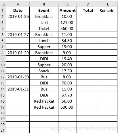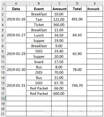 想在Total列中對每日的Amount進(jìn)行匯總,然后對Date和Total進(jìn)行合并居中,效果如下: