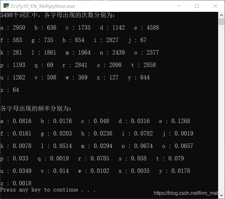 print('5498個詞匯中,各字母出現(xiàn)的次數(shù)分別為:\n')