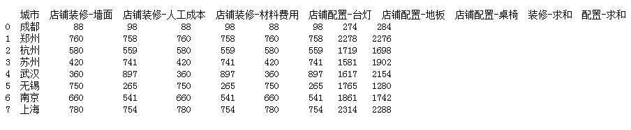 數據代表了各個城市店鋪的裝修和配置費用,要統計出裝修和配置項的總費用并進行加和計算;