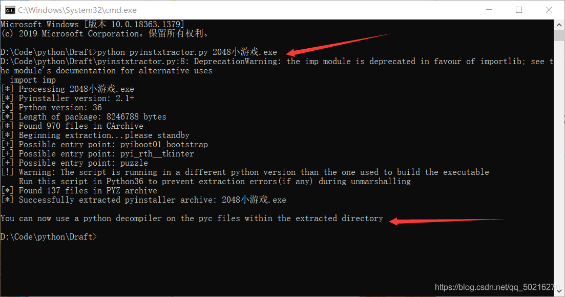 在終端中輸入python后輸入腳本名和待反編譯exe文件名
