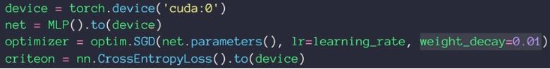 (3)根據正則化的公式,加入正則化后,loss會變原來大,比如weight_decay=1的loss為10,那么weight_decay=100時,loss輸出應該也提高100倍左右。而采用torch.optim的優化器的方法,如果你依然采用loss_fun= nn.CrossEntropyLoss()進行計算loss,你會發現,不管你怎么改變weight_decay的大小,loss會跟之前沒有加正則化的大小差不多。這是因為你的loss_fun損失函數沒有把權重W的損失加上。