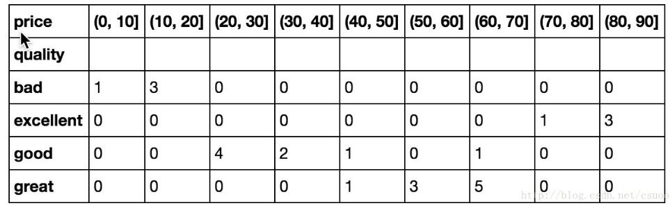 用坐標(biāo)軸來進行比喻, 其中一個變量作為x軸, 另一個作為y軸, 如果定位到數(shù)據(jù)則累加一, 將所有數(shù)據(jù)遍歷一遍, 最后的坐標(biāo)軸就是一張交叉分組表(使用坐標(biāo)軸展示的數(shù)據(jù)一般是連續(xù)的, 交叉分組表的數(shù)據(jù)是離散的).