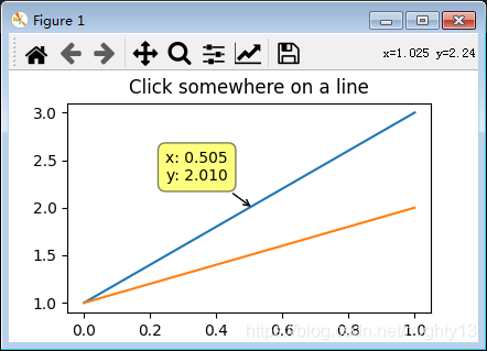 本實例中,有兩個數據元素(artist):line1和line2,datacursor(line1)函數提供了參數line1,因此只有line1可以使用交互式數據光標,line2則沒有效果。