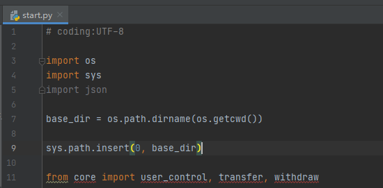 此時start.py是啟動程序,引入了core包中的user_control,transfer,withdraw三個模塊文件