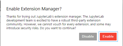 JupyterLab中點擊Settings>EnableExtensionManage,jupyterLab左側邊欄最后一個圖標就是擴展管理,點擊,第一項是個WARNING第三方擴展風險警告,選Enable就可以啟用擴展安裝了