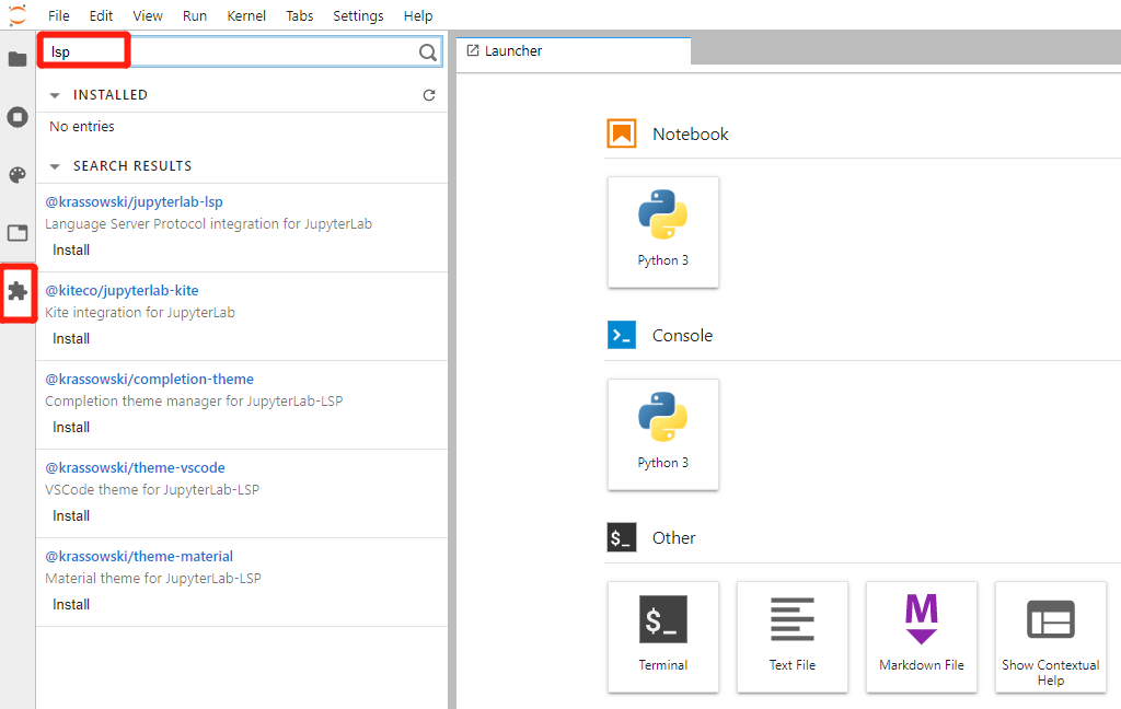 在左側找見插件,搜索kite,安裝好一個叫做@kiteco/jupyterlab-kite的插件。