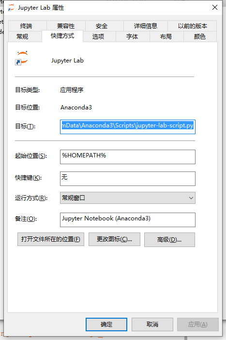 3、右鍵查看副本的屬性,將目標框中的…\jupyter-notebook-script.py替換為…\jupyter-lab-script.py
