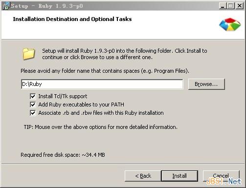 這里我們選擇安裝路徑為 D:\Ruby。 下面有3個選項分別是:(1) 是否安裝tclTk支持。(2) 添加ruby命令路徑到系統環境變量PATH。(3)是否將 .rb 和.rbw 文件關聯到Ruby。