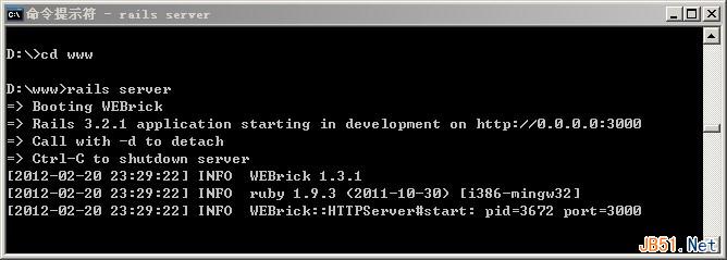 接著進入www目錄,輸入指令:rails server ,啟動rails自帶的 webrick 服務器。如圖: