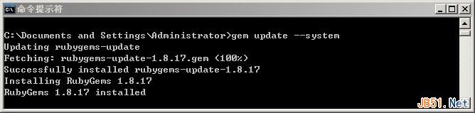 較新的Ruby版本已經包含RubyGems了,因此我們不用手動下載安裝了。只需在CMD窗口輸入指令:gem update --system ,耐心等待一段時間,已有的RubyGems會更新到目前最新的版本。如圖。