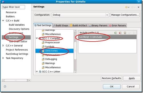 在Eclipse中對項目Build選項進行設置,對Qt庫進行連接,然后就可以進行Linux下的Qt程序進行開發了。