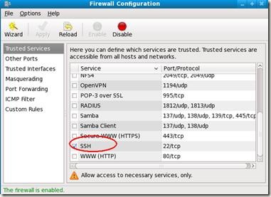 2.如果Linux系統的SSH連接不上,則一般情況下是Linux系統開啟了SSH的防火墻,則只需要在Linux系統中對防火墻進行相關設置,關閉針對SSH的防火墻。【System】--【Administration】--【Firewall】,然后勾選全能SSH。