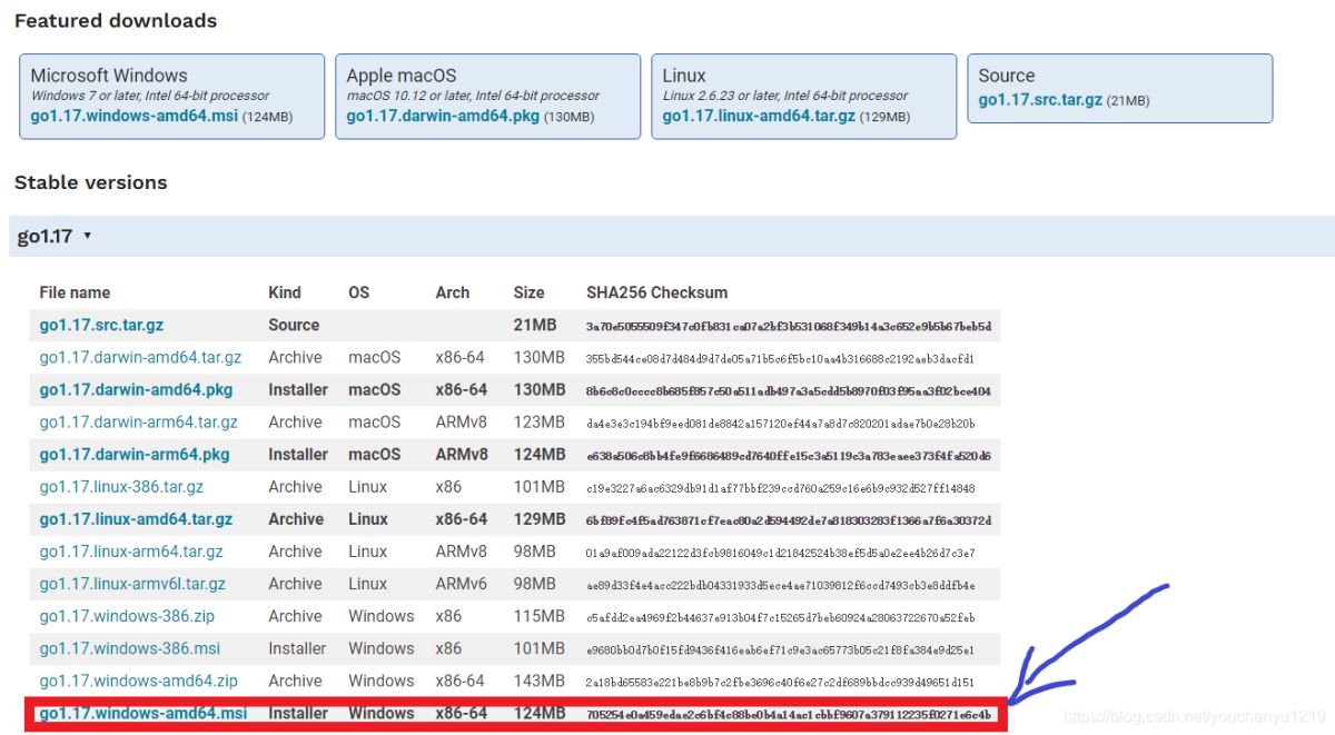選擇相對應的安裝包進行下載,由于電腦是windows系統,下載的是go1.17.windows-amd64.msi,記住要下載后綴為msi的文件。