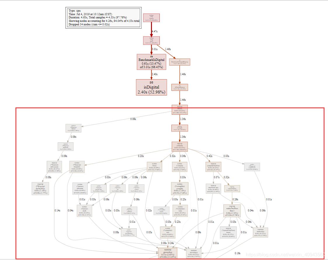 很明顯,正則需要重新分配內存較多,從pprof生成圖也可以看出,正則調用關系錯綜復雜