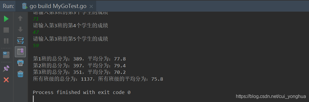 fmt.Printf("第%d班的總分為:%v,平均分為:%v \n",i+1,sum,sum/float64(len(scores[i])))