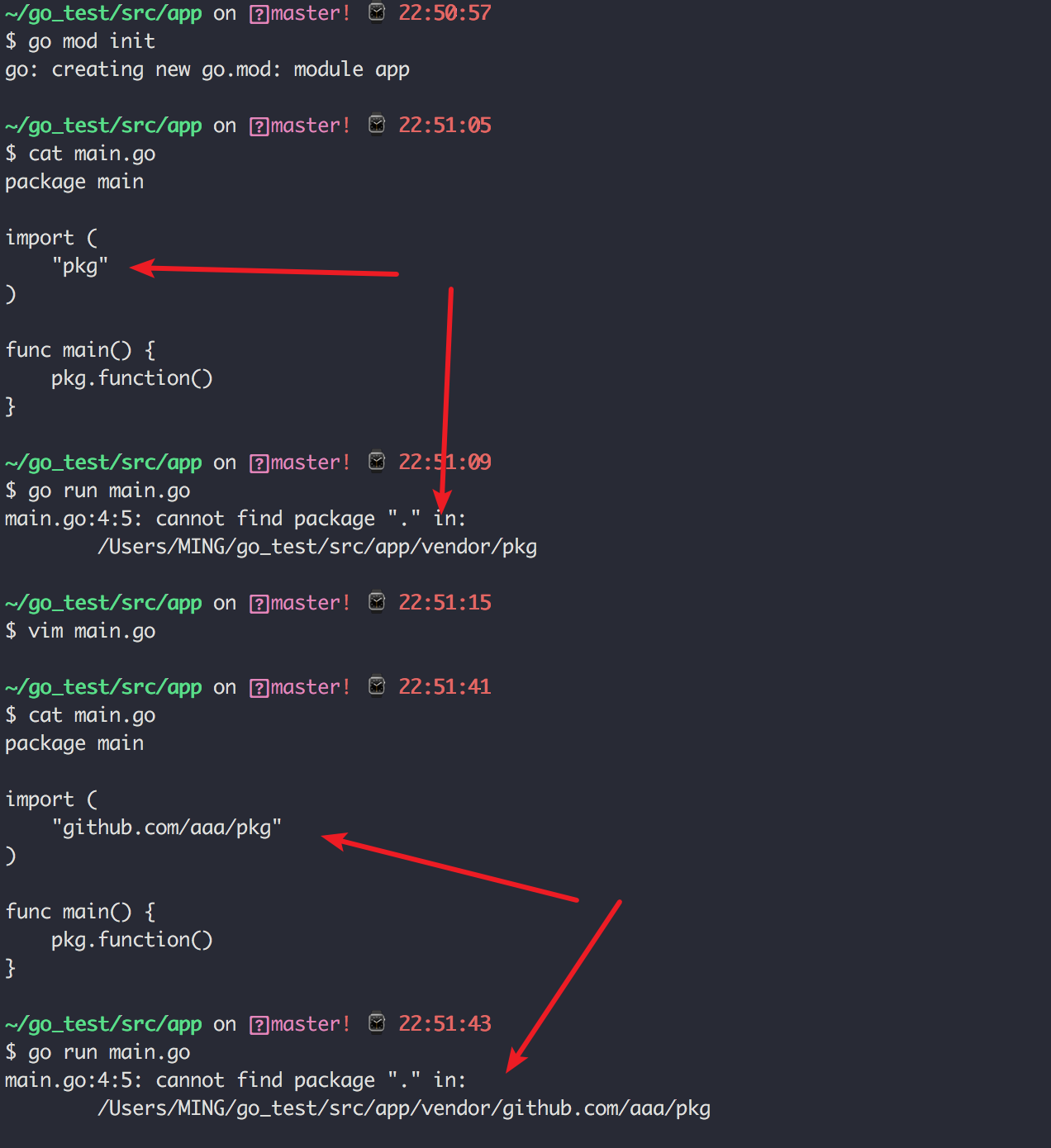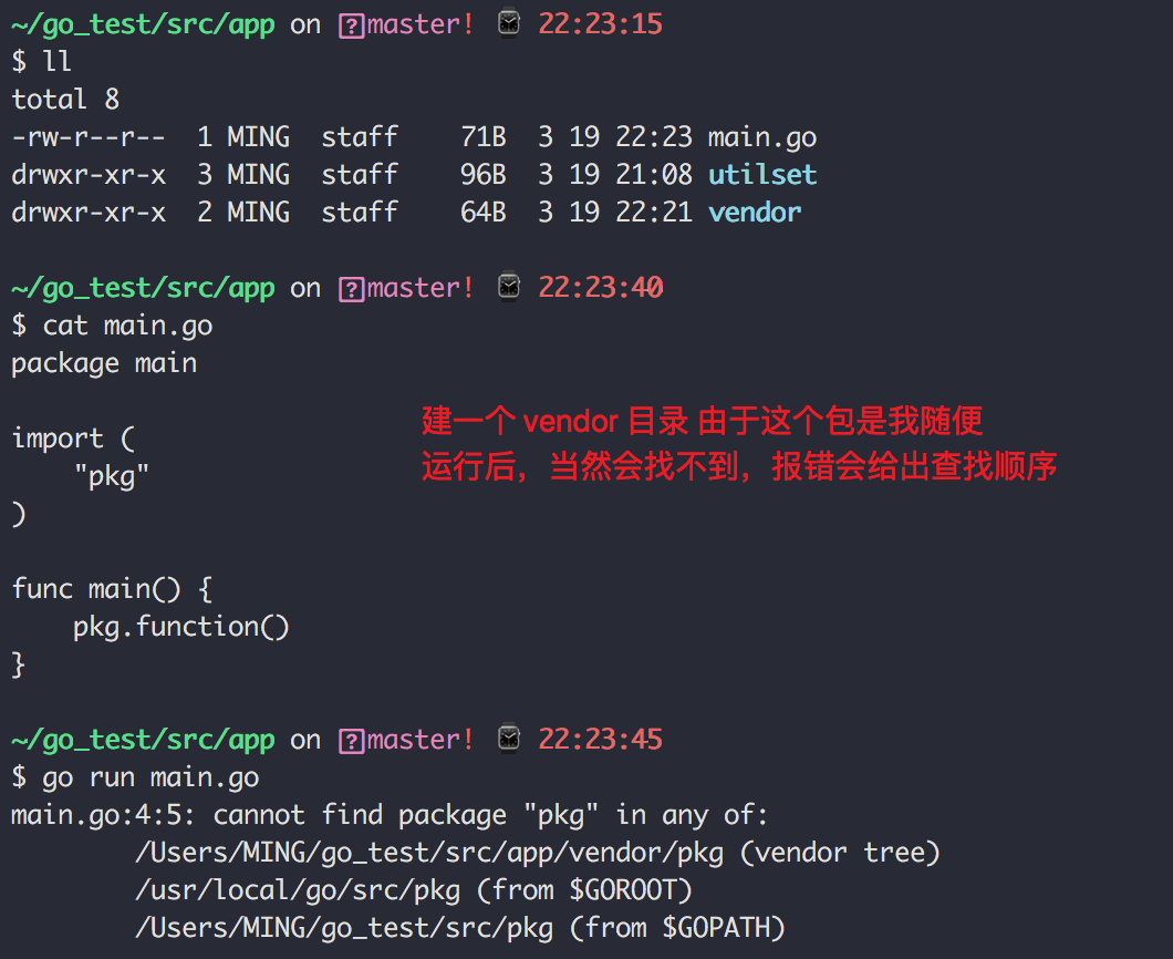 為了驗證這個過程,我在創建中創建一個 vendor 目錄后,就開啟了 vendor 模式了,我在 main.go 中隨便導入一個包 pkg,由于這個包是我隨便指定的,當然會找不到,找不到就會報錯, Golang 會在報錯信息中打印中搜索的過程,從這個信息中,就可以看到 Golang 的包查找優先級了。