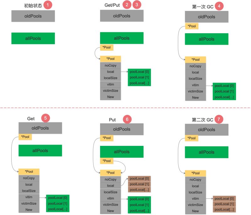 需要指出的是,allPools 和 oldPools 都是切片,切片的元素是指向 Pool 的指針,Get/Put 操作不需要通過它們。在第 6 步,如果還有其他 Pool 執(zhí)行了 Put 操作,allPools 這時就會有多個元素。