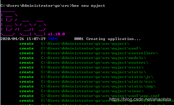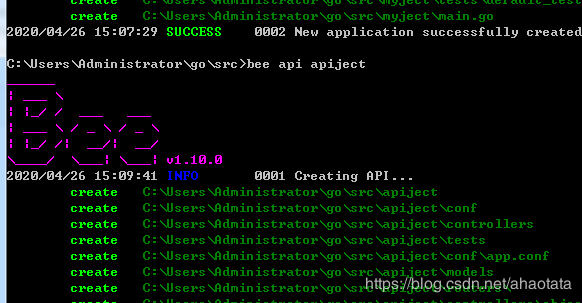 上面的 new 命令是用來新建 Web 項目,不過很多用戶使用 beego 來開發 API 應用。所以這個 api 命令就是用來創建 API 應用的,執行命令之后如下所示: