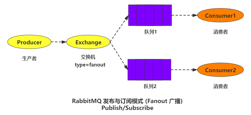 Fanout 直譯為 “扇出” 但是大家更多的會把它叫做廣播或者發布與訂閱,它是一種沒有路由key的模式,生產者將消息發送給交換機,交換機會把所有消息復制同步到所有與它綁定過的隊列上,而每個隊列只能有一個消費者拿到這條消息,如果在一個消費者連接中,創建多個通道,則會出現爭搶消息的結果。