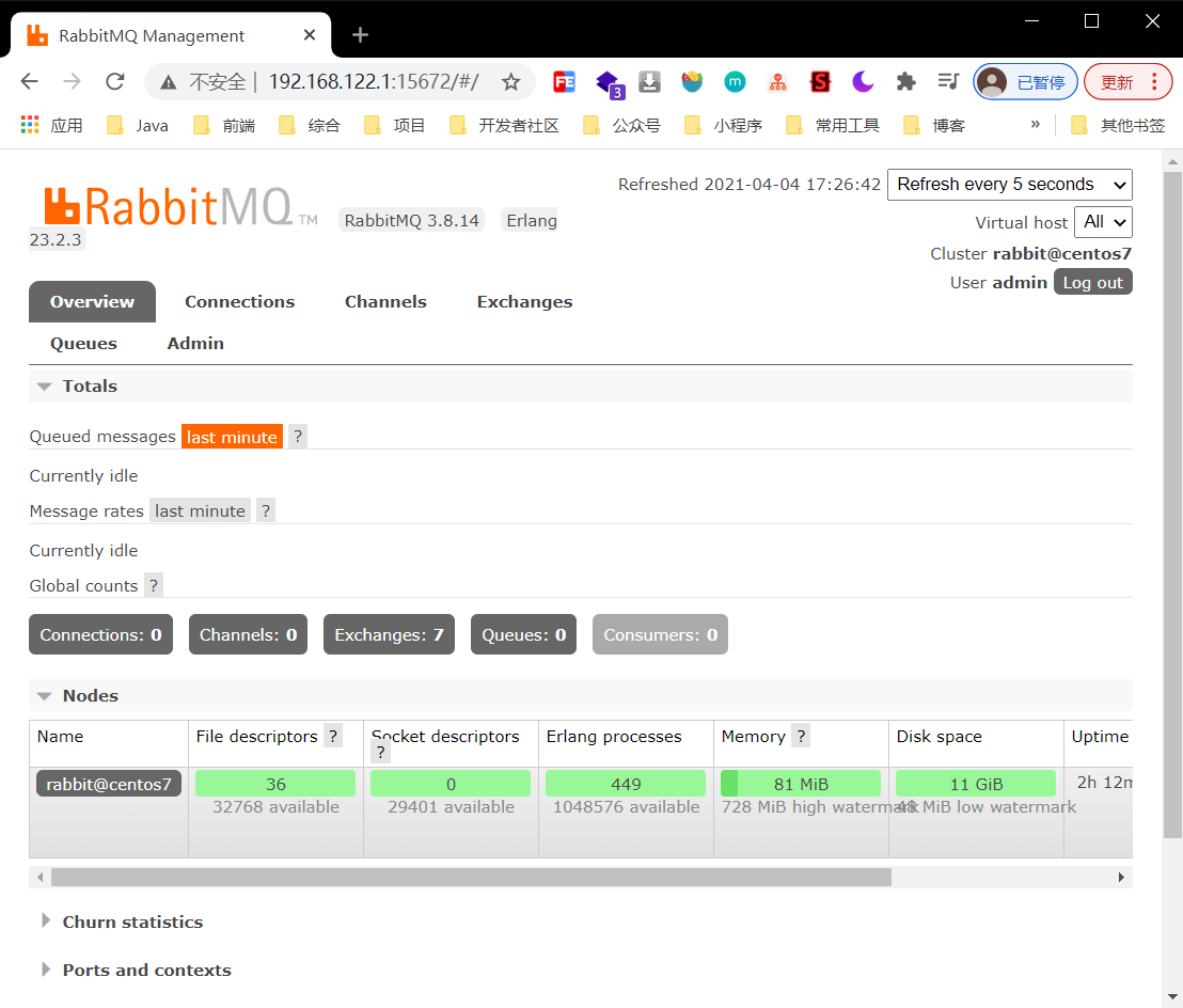6.訪問 Linux IP:15672 ,例如 http://192.168.122.1:15672 ,輸入剛才設置好的用戶名密碼 admin