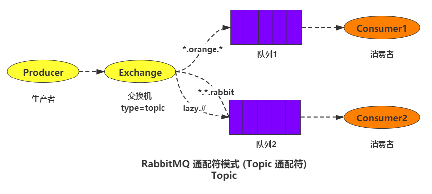 通配符匹配模式的交換機類型為 topic,因為它與 Direct 模式很相似,所以大家有時候也會把 Direct 模式和 Topic 共同歸入路由模式下,它們的區別就是,Direct 模式的 routingKey 是一個指定的值,而 Topic 模式的 routingKey 可以使用通配符, 而且一般都是由一個或多個單詞組成,多個單詞之間以”.”分割,例如: ideal.insert。