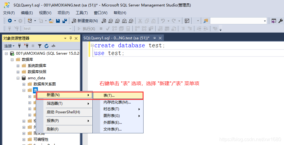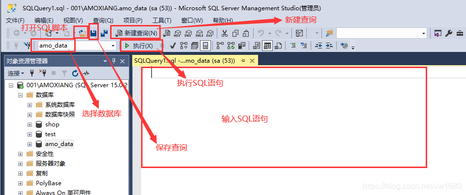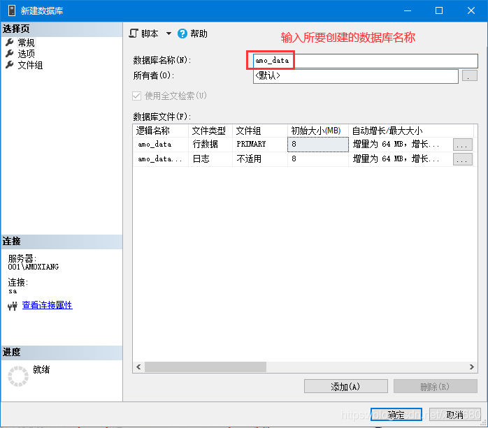 使用可視化管理工具是創建 SQL Server 數據庫最常使用的方法,其特點是簡單、高效。下面將以創建 amo_data 為例,介紹使用可視化管理工具創建數據庫的方法。