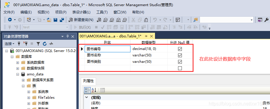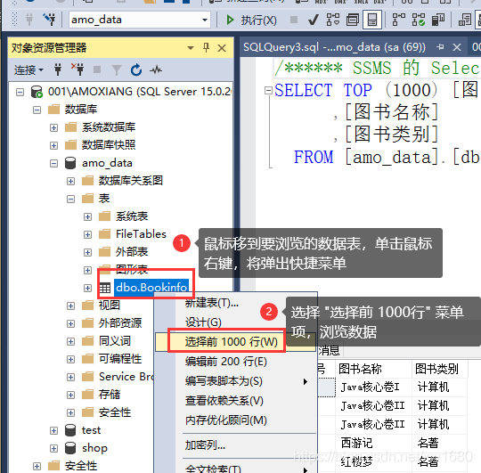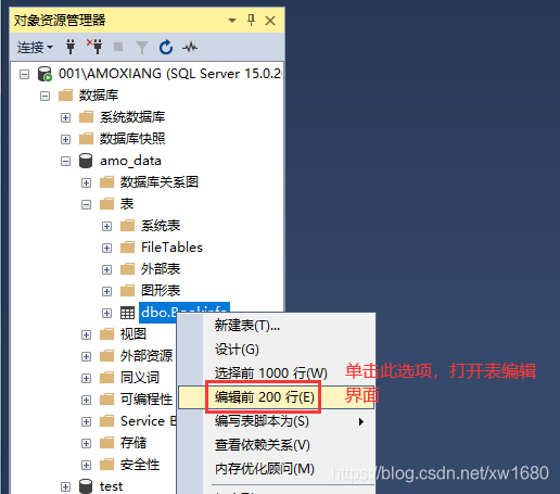 (1 ) 打開 SQL Server 可視化管理工具,單擊以逐級展開當前服務器下數據庫目錄中的 amo_data 數據庫項。