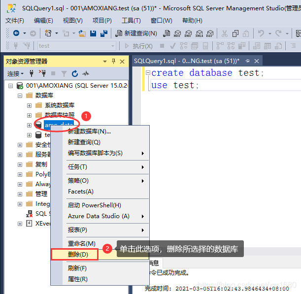 - 打開 SQL Server 的可視化管理工具,依次逐級展開服務器和數據庫節點。