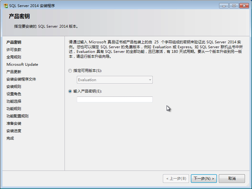 4、單擊“全新 SQL Server 獨立安裝或向現有安裝添加功能”選項,彈出“產品密鑰”對話框。