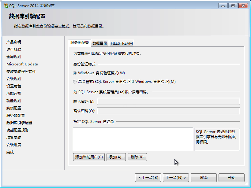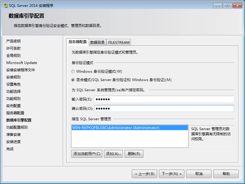 13、這里,使用默認的賬戶配置信息。單擊“下一步”按鈕,彈出“數據庫引擎配置”對話框。