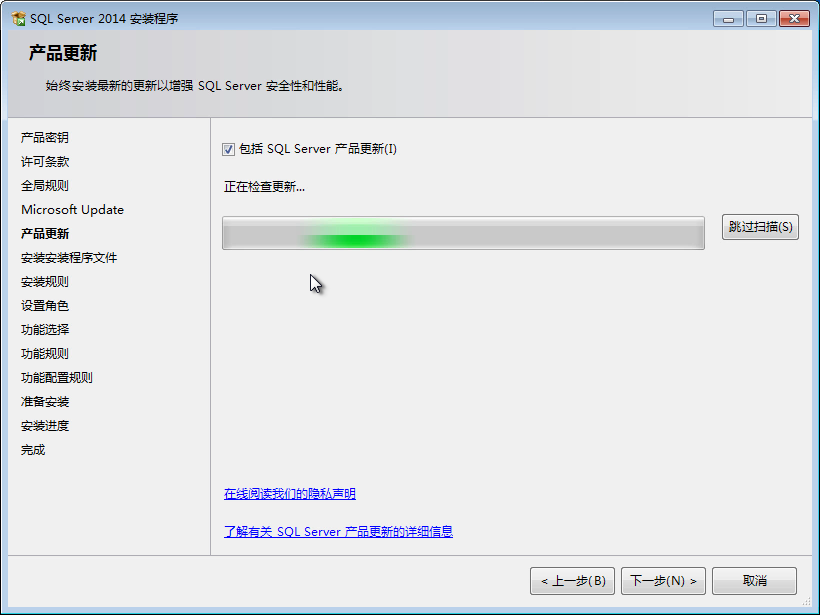 8、不勾選“包括 SQL Server 產品更新”選項。單擊“下一步”按鈕,彈出“安裝規則”對話框。