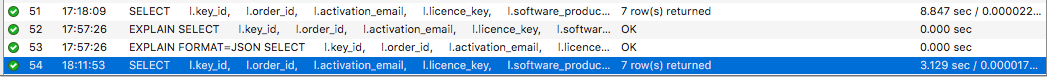 我們知道這是一個關于安全的賭注,在posts 表中software license 行是通過order_id 來跟 WooCommerce order 相關聯的,這在PHP 插件代碼中是強制的。讓我們移除join 來看看有什么提升沒有: