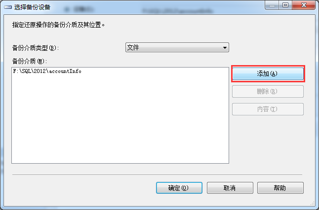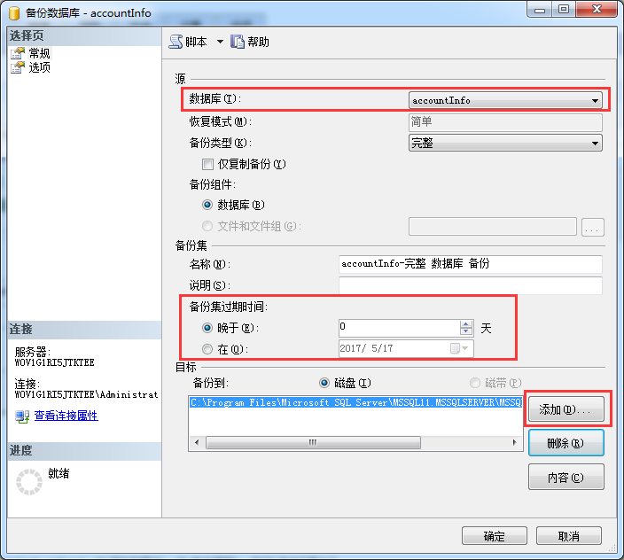 2、在打開的“備份數據庫 —accountInfo”對話框中,先點擊刪除,然后點擊“添加”