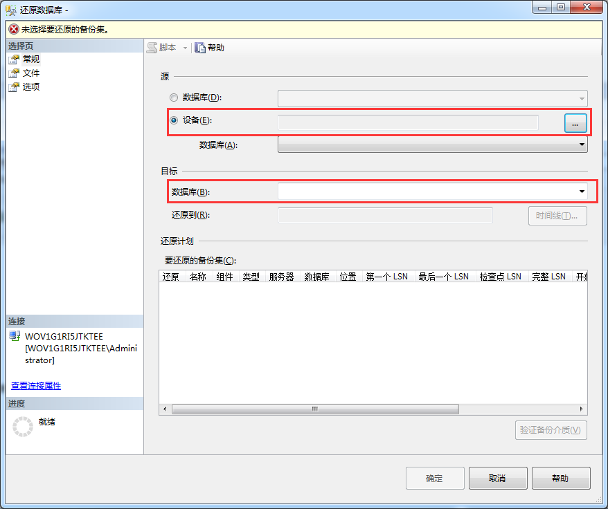 2、在彈出的【還原數據庫】窗口,選擇【設備】,并點擊右側的【...】;在彈出的【選擇備份設備】窗口,點擊【添加】,找到備份的文件;在【還原數據庫】窗口中【目標-數據庫】處輸入數據庫名稱,并單擊【確定】。