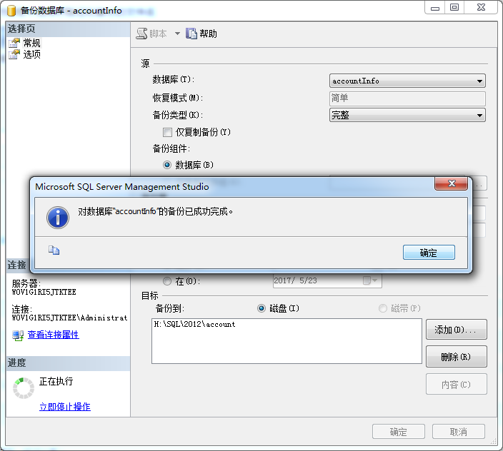 4、之后在備份數據庫窗口點擊確定,等待備份成功