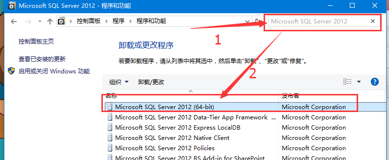 經(jīng)過第一步打開卸載程序后,在里面找到Microsoft SQLserver 2012 (64-bit)這一項(xiàng),可以通過右上角搜索框?qū)ふ遥瑯侵骶褪峭ㄟ^右上角搜索尋找的。