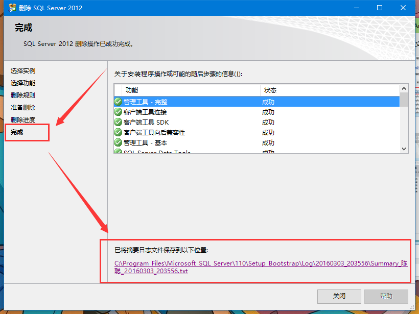 當(dāng)這一步也完成了,那么SQL server 2012已經(jīng)卸載完成了一大半,現(xiàn)在只需要將C盤里面的一些文件刪除和刪除注冊表就行