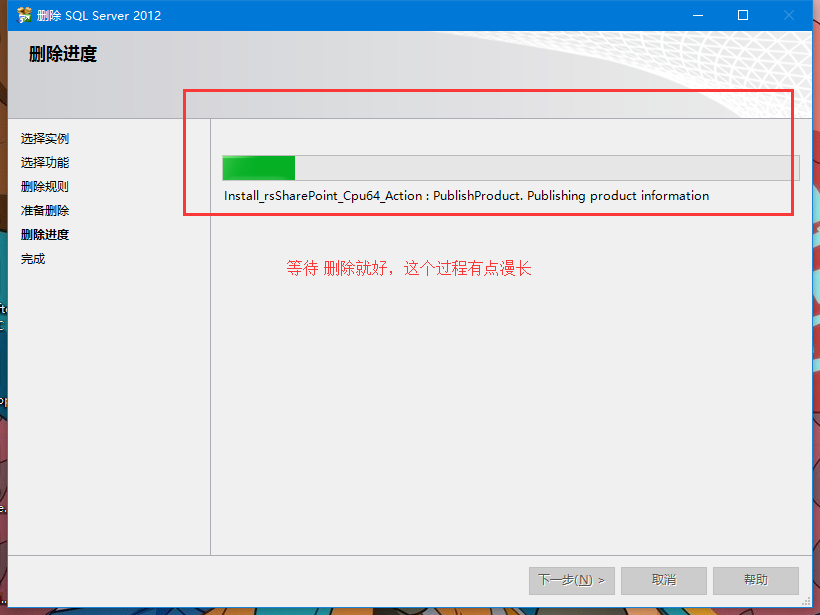當(dāng)?shù)搅藴?zhǔn)備刪除時候,點(diǎn)擊下一步,由于SQL server 2012真的很大,刪除進(jìn)度這一步很慢,大概需要半個小時時間,只需要慢慢等待就行。